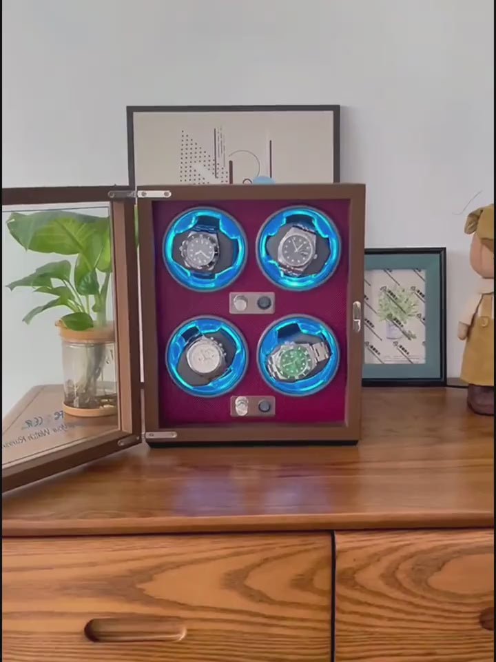 Crafted with a polished wooden exterior and soft interior lining, this winder features two independently rotating slots, adjustable settings, and a clear viewing window. Silent motors ensure smooth, quiet operation.